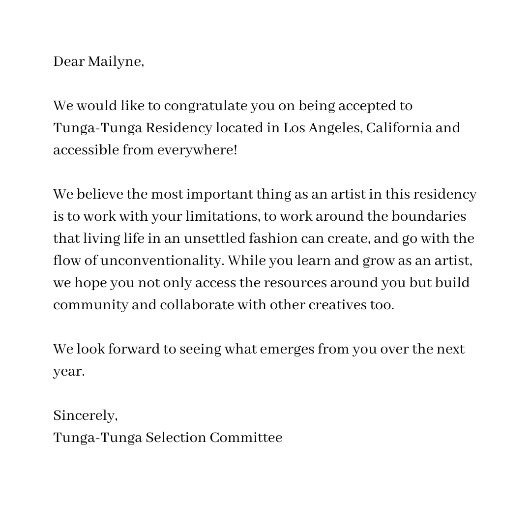 We would like to congratulate you on being accepted to Tunga-Tunga Residency located in Los Angeles, California and accessible from everywhere!